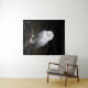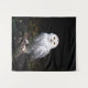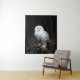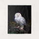Tierporträtfotografie der majestätischen, schneebedeckten Eule, die auf einem Zweig stehend ist.