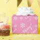 Dieses hübsche Packpapier ist rosa mit den Worten Frohe Weihnachten in Weiß, und viele Schneeflocken. Sie können die Wörter ändern und Ihre eigenen hinzufügen.