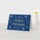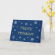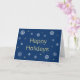 Eine klassische und zeitlose Urlaubskarte für jeden! Gute Ferien in Gold. Weiße und goldene Schneeflocken. Dunkelblauer Hintergrund. Die Innenseite der Karte ist leer.