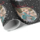 Dieses Weihnachtsgeschenkpapier zeigt eine Grafik eines runden Baumschmucks mit einem individuellen Rahmen für das Foto. Die Worte "Frohe Weihnachten" umkreisen die Außenseite des Fotos. Der Hintergrund ist schwarz mit weißen Punkten, die Schneeflocken darstellen. Fotografie © Storytree Studios, Stanford, CA