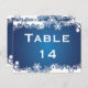 Schneeflocken blauen Winter Hochzeit Tischnummer Postkarte, mit einem weißen Rand von Schneeflocken auf leuchtendem blauem Boden. Eine perfekte Wahl für Winterhochzeiten im Dezember.