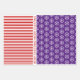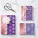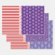 Schneeflocken, Weihnachtsbäume und rote Streifen drei Töne lila Wrapping Paper Sheets mit roten Weihnachtswünsche. Ein Blatt zeigt ein niedliches Muster von Schneeflocken und roten weißen Streifen. Der zweite ist schneebedeckt und der dritte ist in verschiedenen lila Farbtönen gehalten. Es gibt auch den Text "Frohe Weihnachten" in rot auf allen Blättern. Personalisieren Sie es mit Ihrem Text.