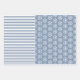 Schneeflocken, Weihnachtsbäume und Streifen staubige blaue Wrapping Paper Sheets. Ein Blatt zeigt ein niedliches Muster von Schneeflocken und Streifen auf staubblauem Himmel. Der zweite ist mit Schnee und den dritten weißen Bäumen bepflanzt.