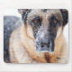Nahes Foto eines schneebedeckten deutschen Schäferhundes.