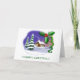 Schneesichere Winterlandschaft mit rauchender Keule aus einer Hütte, schneebedeckten Bäumen, heilig mit Beeren und grünem Band. Nachricht: Die Grüße der Jahreszeit!