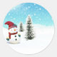 Dieses einfache Bild ist von einem Schneemann, der im Schnee zwischen Kiefern stehend ist.