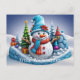 Fröhlicher Schneemann im Winterwunderland - Ein bezauberndes Weihnachtsmotiv zeigt einen fröhlich lächelnden Schneemann mit einer blauen Mütze und buntem Schal, umgeben von liebevoll geschmückten Tannenbäumen, Geschenken und verschneiten Hügeln. Die leuchtenden Farben, verspielten Details und die warme, festliche Atmosphäre machen dieses Bild perfekt für die Weihnachtszeit. Ideal für Grußkarten, Poster, Tassen, Kissen oder winterliche Dekoartikel – ein echtes Highlight für alle, die den Zauber von Weihnachten lieben.