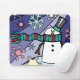 Schneemannkunst, die eine Winterszene mit einem Schneemann kennzeichnen, dessen Schal in einem Blizzard durchbrennt und große, bunte Schneeflocken.