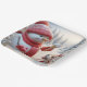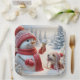 Ein fröhlicher Schneemann trägt einen roten Hut und Schal und hält eine Eistüte mit einem Hund, der ihn im tiefen Schnee sieht