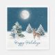 Niedlicher Schneemann und Buchhirsch in Schneeflocken mit Winterkiefern und glühendem Vollmond. Die Farbe des Himmels kann geändert werden. Text ist bearbeitbar.