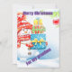 Schneemann Weihnachtskarte Der kleine Schneemann mit rotem Hut und gelbem Schal hält gelbe und blaue Geschenke, um Geschenke für die schneebedeckte Nacht zu liefern. Mit Freude geben Sie Ihren Lieben am Heiligabend Segnungen.