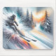 Ein Skifahrer in Bewegung schneidet sich durch frisches Pulver auf einem schneebedeckten Hang, mit lebhaften Farben, die einen dynamischen Sprüheffekt erzeugen