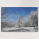 Am Morgen nach einem leichten Schnee. Schneebedeckte Bäume und hellblauer Himmel sorgen für eine magische Szene.