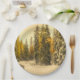 Papier Teller mit einem schönen Naturfoto. Ein abgeschiedener Winterweg mit hohen schneebedeckten Kiefern. Eine goldene Dämmerung schafft ein zauberhaftes Gefühl für dieses Foto.
