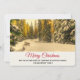 Eine flache Weihnachtskarte mit einem schönen Naturfoto. Ein abgeschiedener Winterweg mit hohen schneebedeckten Kiefern. Eine goldene Dämmerung schafft ein zauberhaftes Gefühl für dieses Foto.