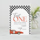 Modern und Spaß Einladung zum ersten Geburtstag Ihres kleinen Rennfahrers zu feiern. Schnelle Einladung eines Geburtstags überprüfte Hintergrund.