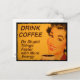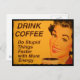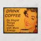 Eine lächelnde Frau mit Retro-rotem Lippenstift und Nägeln trinkt ihre Tasse Morgenkaffee. Die Überschrift lautet: "Trink Kaffee - Mach die Dummheiten schneller mit mehr Energie."