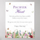 Dieses Schnuller-Jagd Baby Duschspielzeichen bietet einen eleganten und hübschen Garten mit Aquarellfarben, Rosa und Violett, einschließlich Tulpen, Lavendel, Rose und Eukalyptuspflanzen mit leuchtend farbigen Schmetterlingen und Hummeln, die herumfliegen. Sie können alle Text- und Grafikplatzierungsdetails an Ihre spezifischen Anforderungen anpassen.
