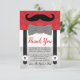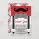 Die Babydusche ist mit einem kleinen Mann-Thema ausgestattet, mit einem Schnurrbart, Aufhängern und Bugs-Krawatte und einem karierten Hintergrund in Rot, Grau, Weiß und Schwarz. Passende Einladung und Dekoration im Laden.