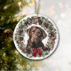 An der Vorderseite dieses Holiday-Ornament ist ein Bild eines Schokoladenhundes Labrador Retriever Hunde gerahmt durch einen hübschen Aquarellkiefer und Beerenfeuer Holiday Kranz. Das Hundebild ist in der Mitte auf einem weißen Hintergrund. Ein glänzender roter Bogen verleiht dem Kranz ein bisschen Weihnachten. Die Rückseite des Ornaments hat den gleichen Kranz mit Ihrem benutzerdefinierten Text in rot und dunkelgrün.