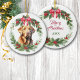 Dieses hübsche Holiday-Ornament besticht durch ein wunderschönes Aquarellbild eines schokoladenbraunen Labrador Retriever. Der Hund ist gerahmt mit einem heiligen und roten Beerenkranz, oben mit einem kräftigen roten Bogen. Die Rückseite des Ornaments hat den gleichen roten Bugkranz, mit zwei Textfeldern, die Sie anpassen können.