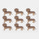 Desteis originelle Cartoon-Illustration einer niedlichen glatten Haar Schokolade braun und tan Coat Farbe Dackel züchten Hund. Das Hundedesign wird neunmal auf jedem Blatt platziert. Der Hintergrund weist ein Muster grauer Hundepfoten auf.