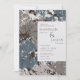 Diese 5" x 7" Hochzeitseinladungen zeichnen sich durch ein abstraktes Blatt-Design in Schattierungen aus staubigen Schieferblau, Taupe und Schokolade mit den Platzhaltern aus: "Zusammen mit ihren Familien, bitte mitmachen", die Braut und Bräutigam Vor- und Nachnamen, "für ihre Hochzeit", Datum, Uhrzeit, Ort der Hochzeit und Anschrift, "Empfang zu folgen".