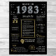 Treten Sie in das Jahr 1983 mit unserem bezaubernden digitalen Geburtstagsposter ein, das mit historischen Fakten, bedeutsamen Ereignissen und faszinierenden Erzählungen aus der Vergangenheit überfüllt ist. Das mit eleganten Gold- und Silberakzenten geschmückte Geburtstagsposter strahlt zeitlose Faszination aus. Ob stolz auf die Ansammlungen zum Geburtstag gezeigt oder als Sake geschätzt, es verspricht, anregende Gespräche zu führen und geschätzte Erinnerungen zu wecken. Unser Geburtstagsposter bietet einen faszinierenden Einblick in das Jahr 1983, indem es sich in Aspekte wie Durchschnittseinkommen, bemerkenswerte Erfindungen, bedeutende Ereignisse, Mode-Trends und umgangssprachliche Ausdrücke der Zeit einfügt. Sie wirft ein Schlaglicht auf zentrale Momente wie den Zusammenbruch der sowjetischen Gewerkschaft, die Rückkehr des Halleschen Kometen und das Entstehen eines zerbrechlichen Tanzes. Bemerkenswerte Erfindungen wie PCs, CDs und künstliche Herzen werden hervorgehoben, was die bemerkenswerten technologischen Fortschritte der Ära widerspiegelt. Insgesamt erfasst das Geburtstagsposter das Wesen des Lebens in den 1980er Jahren, kapselt technologische Innovation, Lebenshaltungskosten und kulturelle Phänomene wie Musik und Mode. Es dient als ein unvergesslicher Gesprächsstarter bei Geburtstagsfeiern und Jubiläen, und wenn elegant gerahmt, verwandelt es sich in ein gepflegtes Memento.