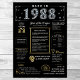 Treten Sie zurück ins Jahr 1988 mit unserem bezaubernden digitalen Geburtstagsposter, das mit historischen Fakten, bedeutsamen Ereignissen und faszinierenden Erzählungen aus der Vergangenheit übersät ist. Dieses Plakat mit elegantem Gold- und Silberakzent-Set vor einer atemberaubenden schwarzen Kulisse verströmt zeitlose Anziehungskraft. Ob stolz auf die Ansammlungen zum Geburtstag gezeigt oder als Pfand geschätzt, es verspricht lebendige Diskussionen zu entfachen und geschätzte Erinnerungen zu erwecken. Unser Geburtstagsposter bietet einen faszinierenden Einblick in das Jahr 1988 und erforscht Facetten wie Durchschnittseinkommen, bemerkenswerte Erfindungen, bedeutende Ereignisse, Mode-Trends und umgangssprachliche Ausdrücke der Zeit. Er hebt Schlüsselmomente wie den Zusammenbruch der sowjetischen Gewerkschaft, die Rückkehr des Halleschen Kometen und den Aufstieg des Breakdance hervor. Prominente Erfindungen wie PCs, CDs und künstliche Herzen werden präsentiert, was den bemerkenswerten technologischen Fortschritt der Ära widerspiegelt. Insgesamt verkörpert das Geburtstagsposter das Wesen des Lebens in den 1980er Jahren und erfasst sowohl technologische Innovationen als auch kulturelle Phänomene wie Musik und Mode. Es dient als einnehmender Gesprächsstarter bei Geburtstagsfeiern und Jahrestagen, und wenn geschmackvoll gerahmt, wird es zu einem gepflegten Memento, das den Geist der Zeit für die nächsten Jahre bewahrt.
