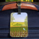 Ein Gepäckanhänger mit einem wunderschönen Bild einer Naturlandschaft: Ein Vogel, der auf einem verwitterten Zaun sitzt, Wildblumen, die um den Zaun wachsen, ein Bauer auf einem Traktor, der sein Land bearbeitet, Bäume mit Blätter und Bauernland mit verschiedenen Farben. Hintergrund, Bild und Text können angepasst werden. Original-Kunstwerk von W.B.