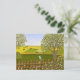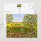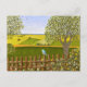 Eine Karte mit einem schönen Bild einer Naturszene: Ein Vogel sitzt auf einem verwitterten Zaun, Wildblumen wachsen um den Zaun herum, ein Bauer auf einem Traktor bearbeitet sein Land, Bäume mit Blättern und Ackerland in verschiedenen Farben. Originalkunstwerk von W.B.