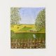 Ein Wandteppich mit einem schönen Bild einer Naturlandschaft: Ein Vogel, der auf einem verwitterten Zaun sitzt, Wildblumen, die um den Zaun wachsen, ein Bauer auf einem Traktor, der sein Land bearbeitet, Bäume mit Blätter, und Bauernland mit verschiedenen Farben. Original-Kunstwerk von W.B.