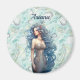 Eine schöne Meerjungfrau mit lang fließendem blauen Haar vor einem Hintergrund von aquamarin mit Muschel und Frondmuster.