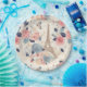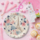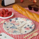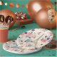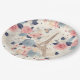 Teller mit französischem Motivbild. Hübsche Blume, Eiffelturm und Schmetterlinge. Die Farben sind pink, blau, pfirsichfarben und creme.