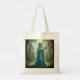 Eine wunderschöne Fee mit einem türkisfarbenen Kleid und eine Halskette aus türkisfarbenen Steinen mit türkisfarbenem, lang türkisfarbenem Haar und eifrigen, drachenartigen Flügeln mit einem holzigen Zweig steht in einem zauberhaften Wald, umgeben von Gras, Felsen und von Weinbäumen bewachsenen Bäumen.