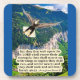 Schöne Bike Coaster einer farbenfrohen, detailreichen Szene mit einem herrlichen Bald Adler, der seine Flügel ausbreitet und hoch in den blauen Himmel über einem üppig grünen Tal am Fuße eines Berges fliegt. Diese Szene begleitet den Bibelvers: "Aber diejenigen, die auf den Herrn warten, werden ihre Kraft erneuern; sie werden sich als Adler mit Flügeln erheben; sie werden laufen und nicht erschöpft sein; und sie werden laufen und nicht ohnmächtig sein." Isaiah 40:31. Dieser Getränkekasten ist ein wunderbares Geschenk oder kann genutzt werden, um uns an das Wort Gottes zu erinnern.
