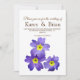 Liebliche Skript Hochzeit Einladung. Violette Blumen auf weißem Hintergrund blumengeschmückt , einfache und elegante Einladung zur Hochzeit.