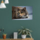 Schöne, flauschige Katze auf graublauem Hintergrun Poster