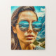 Coole ai Art, die eine wunderschöne Frau mit Sonnenbrille darstellt, die eine Bergkette reflektiert.