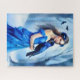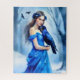 Puzzle in einer Illustration einer jungen Frau in einem blauen Kleid steht in einem schneebedeckten Wald und hält einen Rabe. Die Szene ist ruhig, mit zwei weiteren ravens im Hintergrund fliegen vor einem Hintergrund von nackten Bäumen und einem Dämmerhimmel.