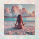 Schöne Frau meditieren auf einem Strand mit weißem Sand und glänzenden Meerglas. Rosa und blau flauschige Wolken und blass blaues Wasser.