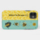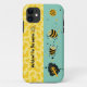 Happy gelbe Honigbienen, fliegen auf der Wabendecke, süße gelbe und schwarze Bienen auf grünem Hintergrund mit Design für die gelbe Wabe. Personalisieren Sie diese, indem Sie den Text bearbeiten oder den Text löschen.