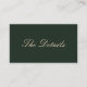 Diese elegante, dunkelgrüne Gästekarte für Hochzeitsgäste kann genutzt werden, um zusätzliche Informationen zu liefern, die Ihre Gäste vielleicht wissen müssen. Dazu gehören Fahrpläne, Informationen zum Empfang, Hotelinformationen oder einfach eine Hochzeitswebsite, auf der Ihre Gäste weitere Informationen finden können.