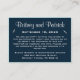 Nautical Navy Blue and White Wedding Accommodation/Empfang Cards - mit marineblau-blauem Hintergrund mit verschiedenen eleganten Schriftart an der Spitze und weißen Silhouetten von Möwen. Informieren Sie Ihre Gäste über besondere Hochzeitsinformationen und die nahe gelegenen Hotelunterkünfte, um Ihre Reise zu Ihrem großen Tag zu erleichtern. Einfach diese Karten mit den passenden Einladungen & RSVP Karten einstecken. Die Empfang-Karten sind in gedruckter Form bestückt. Finden Sie unten passende Produkte auf dieser Seite. Der Kartenvorrat ist Set zu Weiß; Sie können jedoch den Vorrat in Creme, Leinen, Metallic, Aubergschalen-Muschel unter Option 2) ändern. (unterhalb der Personalize-Funktion).