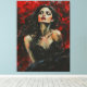 Dieses Kunstwerk ist eine Feier von Schönheit, Anmut und zeitloser Eleganz. Die geschlossenen Augen lassen einen Augenblick der Introspektion oder ruhiger Kontemplation vermuten und laden die Zuschauer ein, die innere Ausstrahlung der Dame zu schätzen. Die Kombination von Elementen - die Merkmale der Dame, der rote Hintergrund und das fließende schwarze Haar - verschmelzen zu einer visuellen Symphonie und machen diese Leinwand zu einer bemerkenswerten Ergänzung zu jedem Raum.