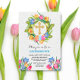 © 2023 Socialite Designs & LICENCORS. Schöne Ostereinladung mit goldenem Kreuz, Tulpenrahmen und Ostereiern. Eine wunderbare Einladung, Familie und Freunde zu einem Osterbrunch, zur Eizellenjagd für die Kinder oder zum Osteressen einzuladen.