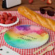 Geburtstagspapier-Teller mit Aquarellfarben mit den Farben des Regenbogens.