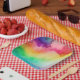 Geburtstagspapier-Teller mit Aquarellfarben mit den Farben des Regenbogens.