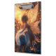 Dieses bezaubernde Bild zeigt eine wunderschöne, ätherische Sonnenfee mit leuchtenden Flügeln, die sanft einen großen Lüster berühren. Das warme, goldene Licht schafft eine zauberhafte und ruhige Atmosphäre.