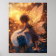 Dieses bezaubernde Bild zeigt eine wunderschöne, ätherische Sonnenfee mit leuchtenden Flügeln, die sanft einen großen Lüster berühren. Das warme, goldene Licht schafft eine zauberhafte und ruhige Atmosphäre.